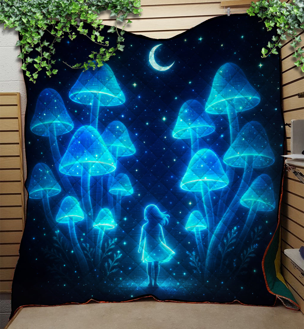 Mystic Girl in Mushroom Forest Quilt Blanket