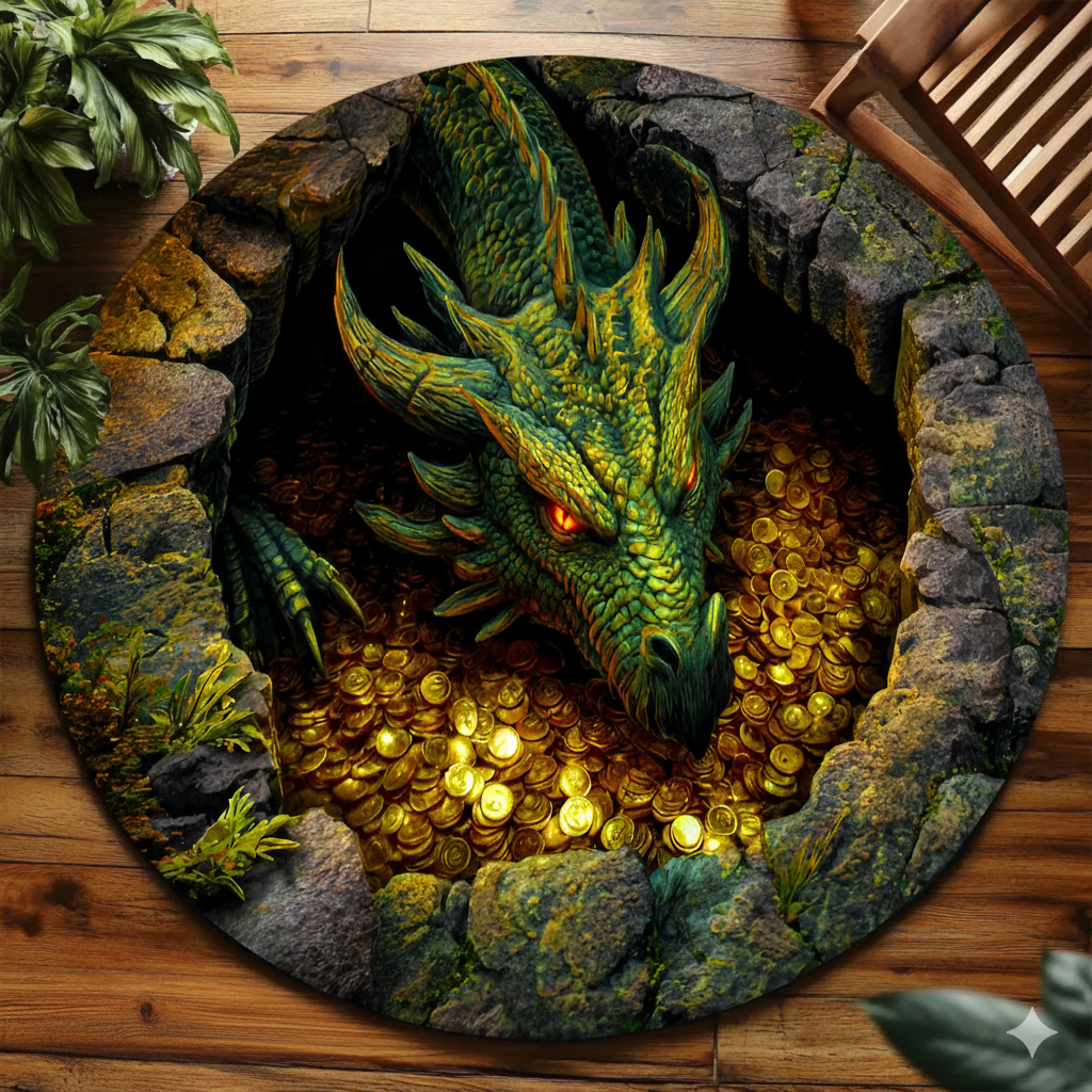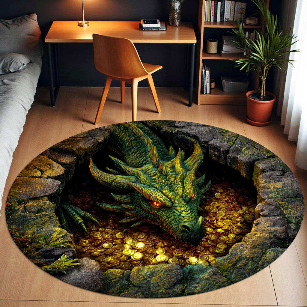 Fantasy 3D Dragon Protects Coin Cave Carpet Round Rug