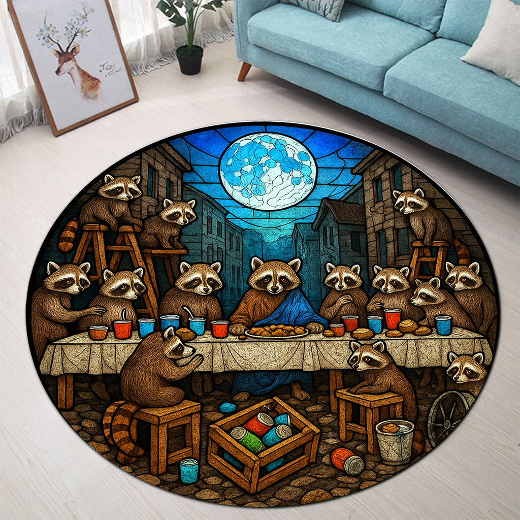 The Last Supper Of Raccoons Stained Glass Round Rug