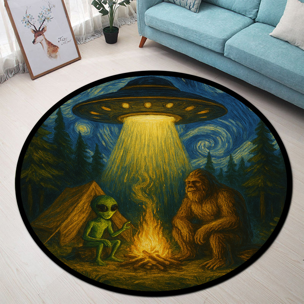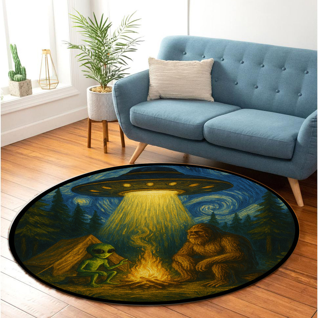 UFO Abducting Alien And Bigfoot In Starry Night Round Rug