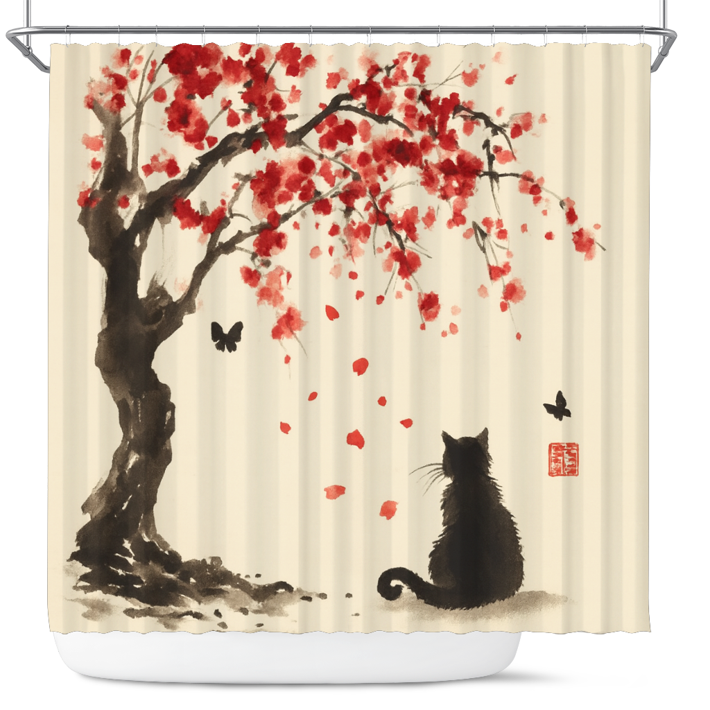 Black Cat Under Cherry Blossom Japan Ink Style Shower Curtain