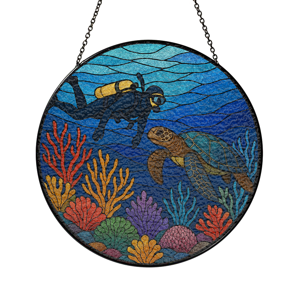 Freediving With Sea Turtle Stained Glass Suncatcher