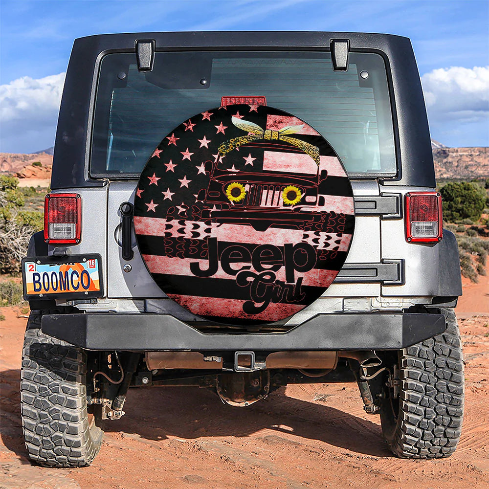Sunflower Jeep Girl American Flag Car Spare Tire Cover